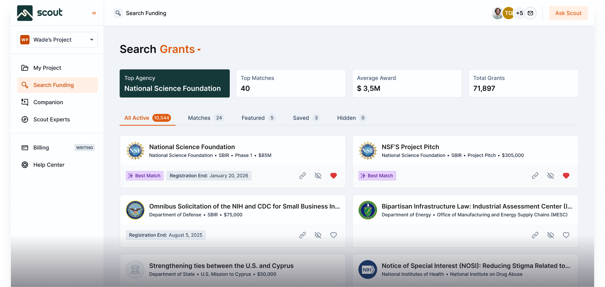 Discover the best-fit funding opportunities instantly with Scout, so you can get started writing faster.